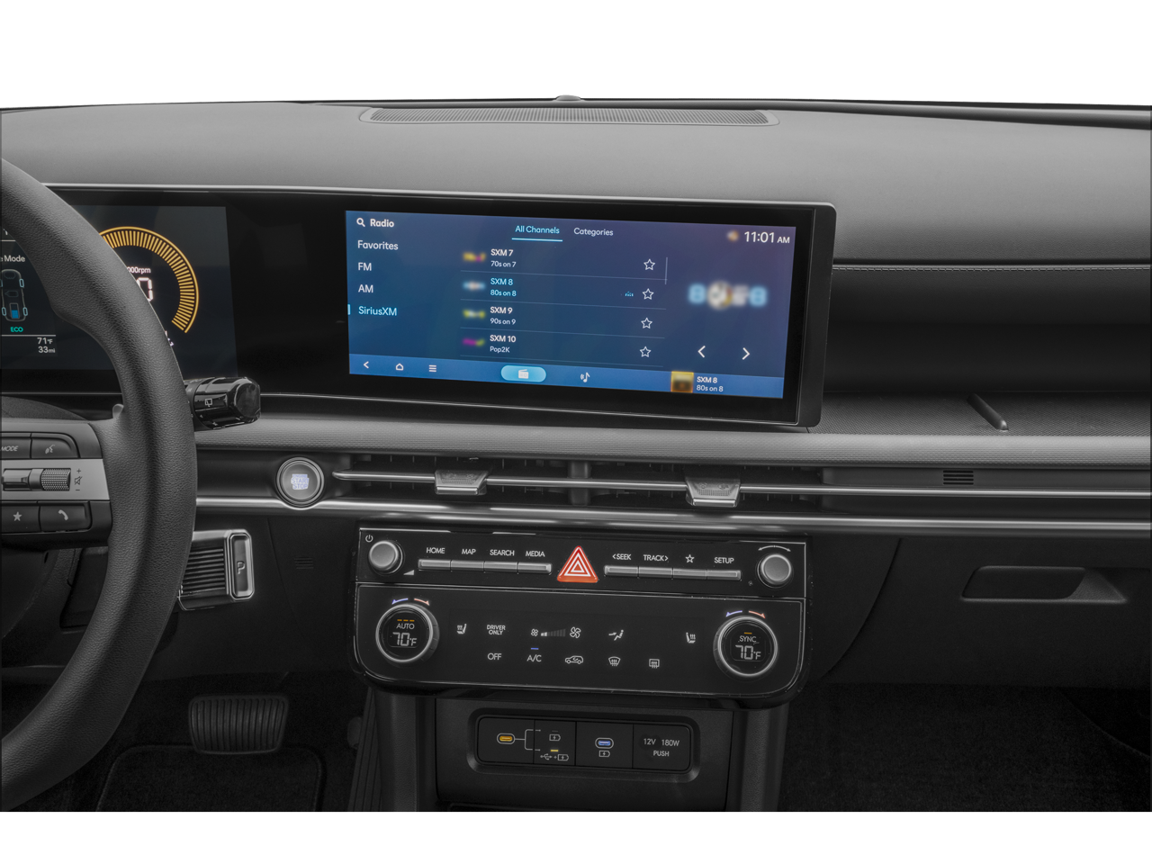 - Radio: AM/FM/HD Audio System -inc: 12.3" color touchscreen display, 6 speakers, SiriusXM satellite radio system (3-month trial subscription), wireless Apple CarPlay and Android Auto integration, controller OTA update capability, Blue Link connected car system and USB connectivity